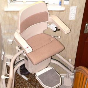 Kurventreppenlift an schmaler Treppe: Auf dem Bild ist ein moderner Treppenlift zu sehen, der an einer Treppe in einem Wohnraum installiert ist. Der Treppenlift ist beige und hat eine gepolsterte Sitzfläche sowie eine Rückenlehne in einem helleren Braunton. Die Armlehnen bieten zusätzlichen Komfort, und an der rechten Armlehne befindet sich eine Steuerung mit Tasten. Der Treppenlift ist so konstruiert, dass er entlang einer Schiene an der Wand verläuft, die Kurven und Richtungswechsel ermöglicht. Der Fußbereich des Treppenlifts hat eine Plattform für die Füße des Benutzers. An der Wand neben dem Treppenlift sind mehrere Steckdosen und ein Lichtschalter zu sehen. Der Raum hat eine beige Tapete und eine braune Tür mit einem klassischen Türgriff.