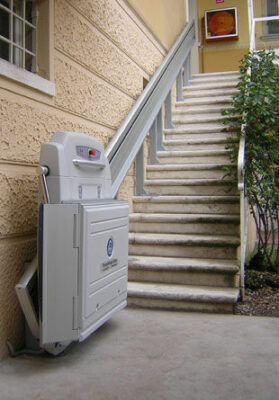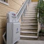 Treppenlift an der Aussenseite eines Hauses: Auf dem Bild ist eine Außentreppe zu sehen, die zu einer höheren Etage eines Gebäudes führt. Die Treppe hat etwa ein Dutzend Stufen und ist von einer Geländeranlage gesäumt. Links neben der Treppe befindet sich ein Plattformlift, der für den barrierefreien Zugang installiert wurde. Der Lift ist zusammengeklappt und an der Wand befestigt. Rechts von der Treppe befindet sich ein kleiner Gartenbereich mit einem großen immergrünen Busch. Das Gebäude scheint alt zu sein und hat eine strukturierte Fassade sowie ein Fenster oberhalb des Lifts. Zudem ist an der Wand oben rechts ein Bilderrahmen angebracht.