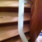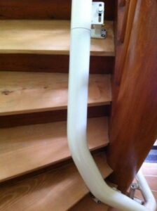 Treppenliftteile mit Treppe befestigt: Das Bild zeigt eine Treppe aus Holz mit einer hellen Lackierung. Die Treppe hat mehrere Stufen und ist Teil einer hölzernen Struktur. An der Innenseite der Treppe ist eine weiße, abgerundete Schiene befestigt, die zu einem Treppenlift gehört. Die Schiene ist beschichtet und scheint aus Metall zu bestehen, sie verläuft entlang der kurvigen Treppenstruktur. Oben auf der Treppe ist ein kleiner Mechanismus oder Halterung zu sehen, der möglicherweise zur Befestigung oder Sicherung der Schiene dient. Die gesamte Szene wirkt gut gepflegt und die Holzstruktur zeigt deutlich sichtbare Maserungen.