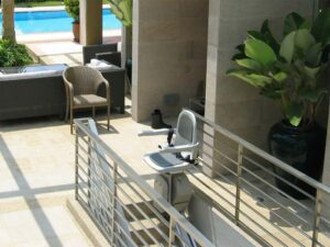 TKE der Weg zum Schwimmbad mit dem Treppenlift: Auf dem Bild sieht man einen modernen Außenbereich, der zu einem großen, einladenden Pool führt. Im Vordergrund befindet sich ein Treppenlift, der an einem Geländer entlangfährt und den barrierefreien Zugang zum Poolbereich ermöglicht. Der Lift deutet darauf hin, dass dieser Bereich für Menschen mit eingeschränkter Mobilität gut zugänglich gemacht wurde. Neben dem Lift stehen stilvolle Rattanmöbel, darunter ein Sessel und eine Couch, die zum Entspannen einladen. Pflanzentöpfe mit üppigen grünen Pflanzen tragen zur luxuriösen Atmosphäre bei. Der Pool im Hintergrund ist von gepflegtem Grün und weiteren Sitzmöglichkeiten umgeben.